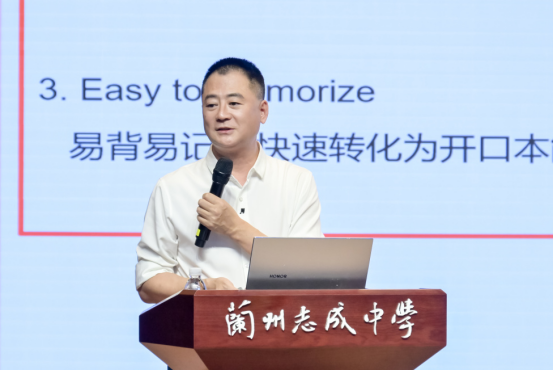 朱波作题为“从综合素质培养到学业水平提升——《新概念英语》如何全面赋能学生发展”的专题讲座。他结合自身学习经历和科学的语言习得理论,讲解了《新概念英语》如何从综合素质培养到学业水平提升,全面赋能学生发展。在教学方法上,他提倡应用“i+1”理解式输入学习方法,鼓励教师在可理解性内容的基础上,结合自身教学风格与学生实际需求,因材施教,高效助力学生英语水平提升。针对课时有限的问题,他建议践行分层推进策略,让学生的学习从课堂内延伸到课堂外,从输入到输出,实现英语核心素养全面提升。他最后强调,教育不仅要实现知识传递,更是要激发学生的内在潜能。
