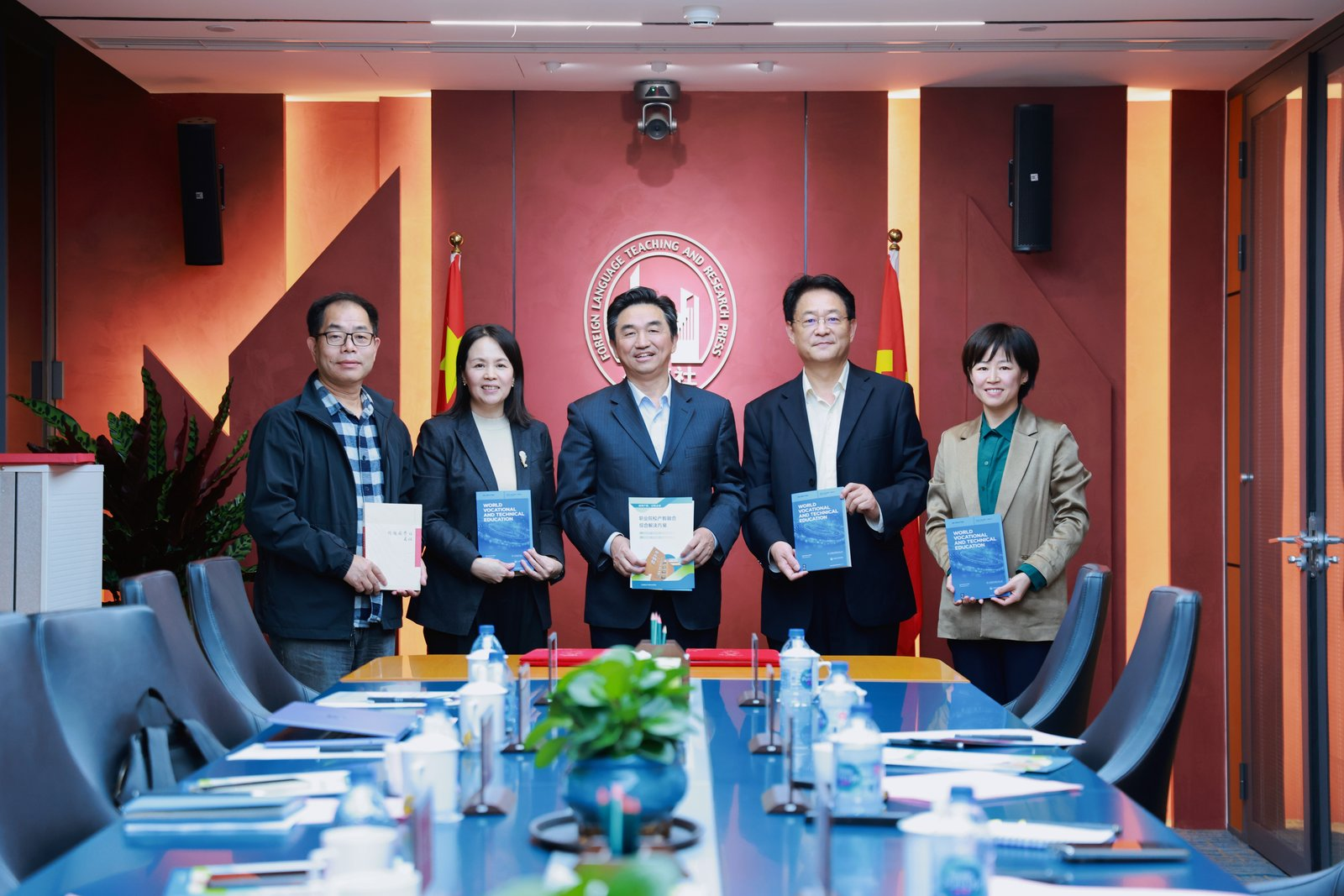 在交流环节,双方参会人员围绕职业教育国际化、校企协同产教融合、共建课程与师资培训平台、推动学生实训就业与行业需求对接等议题展开热烈讨论,就合作细节深入交换了意见。在与会人员的共同见证下,双方共同签署了校企合作协议,并向学院赠送了由外研社出版的《世界职业技术教育》期刊和“列国纪行”系列丛书等精品出版物。