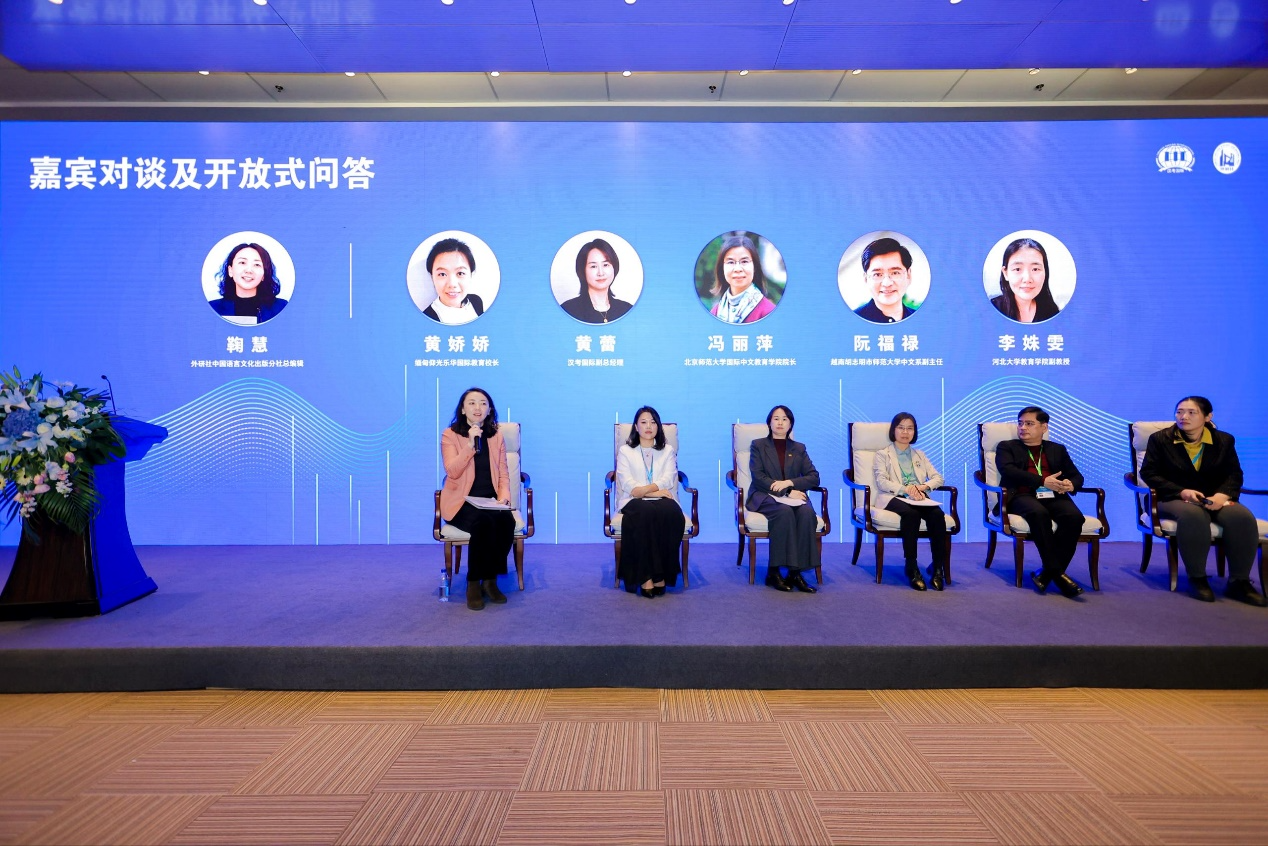 在嘉宾对谈及交流互动环节中,冯丽萍、阮福禄、黄蕾、李姝雯、黄娇娇五位嘉宾结合各自的教育实践、研究成果以及本国中文教育的实际开展情况,围绕HSK 3.0的改革趋势、考生需求与教学应用等关键议题展开深入交流。嘉宾观点鲜明、见解独到,激发了现场及线上观众的思想碰撞。本环节由外研社中文分社总编辑鞠慧主持。