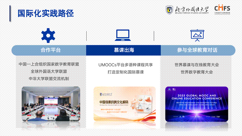 国际化是外语院校的天然基因与时代使命:北外大力开拓高水平国际交流与合作办学,创办“全球外国语大学联盟”等;推进优质慕课“出海”,依托UMOOCs,开发“中国场景的跨文化解码”等多语种慕课;主动参与全球教育对话,连续多年受邀在世界慕课与在线教育大会等国际权威平台分享中国教育数字化转型方案。