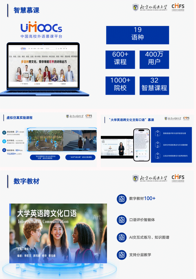 专业化是根基,北外以顶层设计为引领,重塑智慧课程与资源体系:助推复合型人才培养,创设“德语/俄语+大数据管理与应用双学士学位”项目;推进智慧慕课建设,依托中国高校外语慕课联盟,通过UMOOCs平台上线涵盖19个语种、超600门慕课,启动35门示范性智慧课程建设;创新虚拟仿真课程,研发“全球气候治理”等21门多语种口语实训与文化体验课程;推进教材与资源数字化升级,启动100本数字教材建设,广泛融入知识图谱、交互式练习等智能元素。