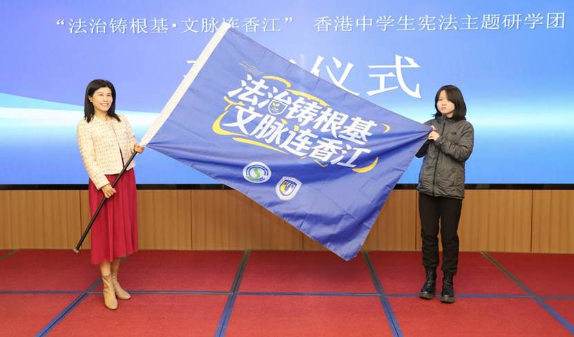 北京外国语大学外研集团党委书记、董事长,外研社社长王芳为研学营队授旗,标志着“法治铸根基·文脉连香江”宪法主题研学活动正式开启。未来四天,全体营员将走进全国青少年学生法治教育实践示范基地接受沉浸式宪法教育,在人民大会堂领会“一切权力属于人民”的宪法原则,走进中国法院博物馆感受法治历史与司法实践的厚重庄严,走进中国海关博物馆探寻粤港澳大湾区法治协同的历史脉络,在故宫礼制建筑中读懂中华文明的法治基因,并深入社区一线观察基层群众自治的生动实践,在“知行合一”中筑牢法治信仰、厚植家国情怀。