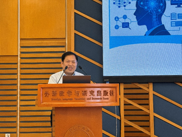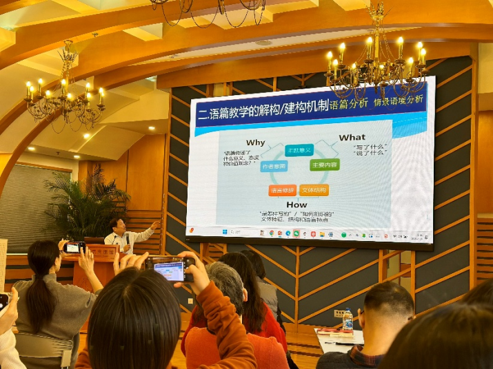 徐继田老师深耕英语语篇教学研究多年,兼具扎实的理论功底与丰富的实践经验,其研究成果紧扣教学一线需求,紧跟前沿技术趋势。在其分享中,徐老师围绕语篇教学的核心理论、AI技术与语篇教学的融合路径展开详细阐述,提出了“师—机—生”三元互动模式,系统介绍了各类语篇分析智能体的应用方案,并结合教学一线案例,深入剖析AI技术在语篇筛选、分析、教学设计等方面的应用场景,为大家提供了一套系统、完整、可操作的实践方案。他指出,在教育数字化转型的大背景下,语篇教学的革新必须紧跟时代发展步伐,通过AI赋能打破传统教学瓶颈,实现教学效率与质量的双重提升。
