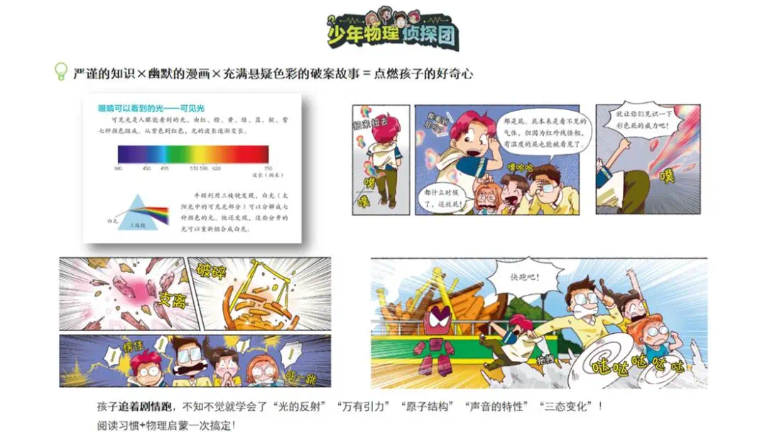 《少年物理侦探团》系列(全5册)专为6-12岁小学生设计,开创性地将物理启蒙与侦探冒险故事相结合。该系列每册围绕一个核心物理主题展开悬疑故事,通过光精灵鲁格、重力精灵格拉蒙等拟人化形象,将抽象的物理概念转化为生动的剧情角色。