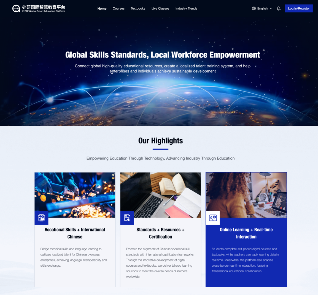 并且,外研社在国际中文领域的深厚积淀也在赋能职业教育“走出去”。外研国际智慧教育平台,创新性地打造了“国际中文+职业技能”双轨体系,既让教育资源跨国流通,又支持国际化人才培养。平台既服务前景广阔的国际中文教育,也着眼中资企业全球产业布局,为关键领域培养专业技能人才。目前,平台合作网络已覆盖“一带一路”共建国家、上合组织成员国和南南合作的参与国家。