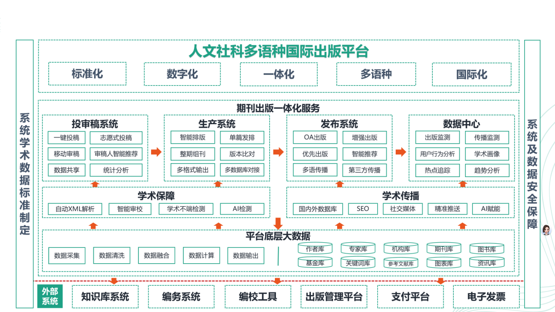 正因如此,外研社在近年间,对支撑数智化转型的“中间层”能力进行了持续投入:管理驾驶舱、出版管理平台、智能审听平台、国际业务管理平台、iPublish数字出版平台等数智平台相继上线。这些系统构成了支撑外研社数智化发展的底层基础。