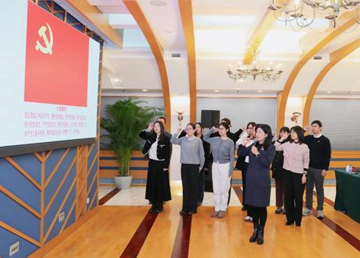在2025年度新党员入党宣誓仪式环节,全体高唱《国际歌》后,王芳书记宣读参加入党宣誓仪式的新党员名单,并带领11名新党员同志面向党旗庄严宣誓,与会全体党员一同重温入党誓词。新党员代表张路路发言,表达了将以实际行动践行初心、用实干奋斗兑现誓言的坚定决心。