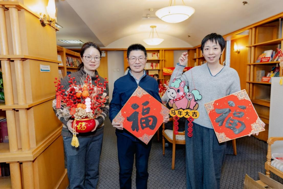 活动现场暖意融融、喜气洋洋。大红洒金纸、朱红春联笺与福字中国结铺满长桌,将阅览室装点得年味十足。报名参加活动的同事陆续到来,欢声笑语此起彼伏:有人埋头拼接,将造型卡与珍珠链扎成一盏盏玲珑鱼灯,晕染出幸福的色彩;有人巧手粘贴,把布片、绒花组合成寓意吉祥的萌马挂件;还有人专注搭配,将金钱叶、发财果错落插进福桶里,让瓶中盛满红火的期许。美好的祝福与艳丽的花枝相映成趣,恰似外研社新一年的美好图景——百事呈祥,蒸蒸日上。