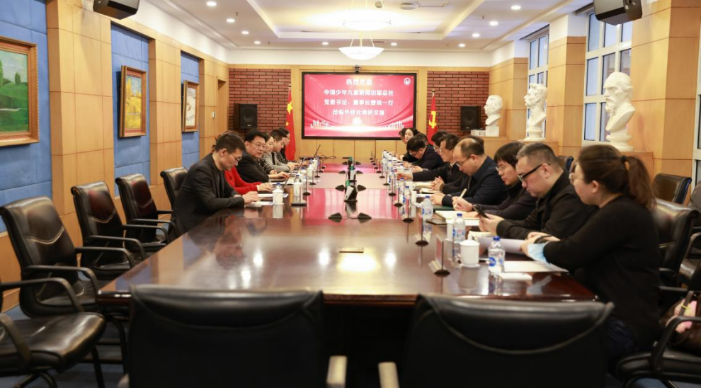 2026年2月5日,中国少年儿童新闻出版总社(以下简称“中少总社”)党委书记、董事长曾锐一行到访外语教学与研究出版社(以下简称“外研社”)。外研社党委副书记、副董事长、总编辑刘捷会见曾锐一行,双方就数智化转型、融合发展实践、新媒体营销等方面进行深入交流。中少总社党委常委、副总编辑蔺玉红,党委常委、副总经理杜延玺,党委副书记、纪委书记刘宇出席座谈会。