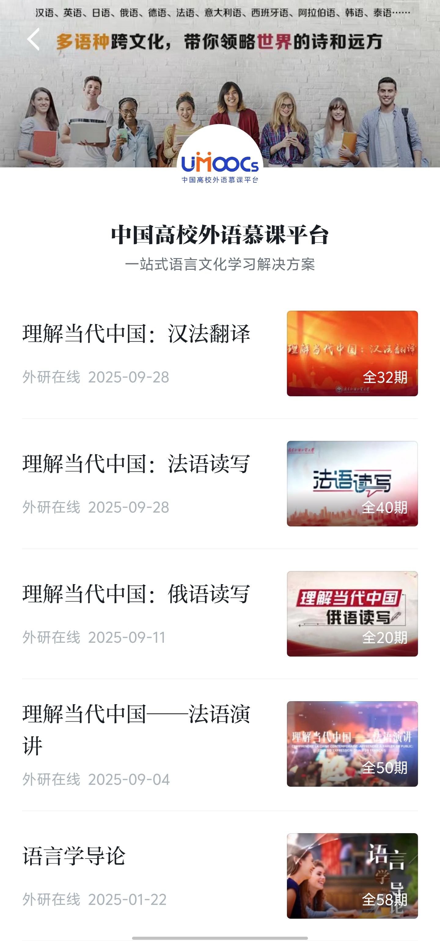 中国高校外语慕课平台UMOOCs由中国高校外语慕课联盟理事长单位北京外国语大学创立,是我国首个以外语学科特色为主的国际化慕课平台。自2019年起,中国高校外语慕课平台与“学习强国”深度合作。“学习强国”特设慕课专栏——“中国高校外语慕课平台”子栏目,重点引进 UMOOCs上的“理解当代中国”“区域国别”等系列多语种精品慕课。
