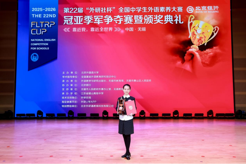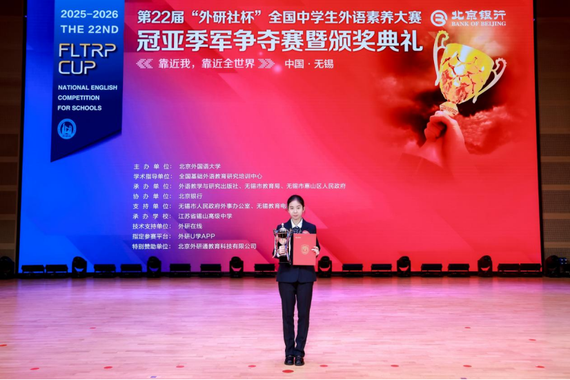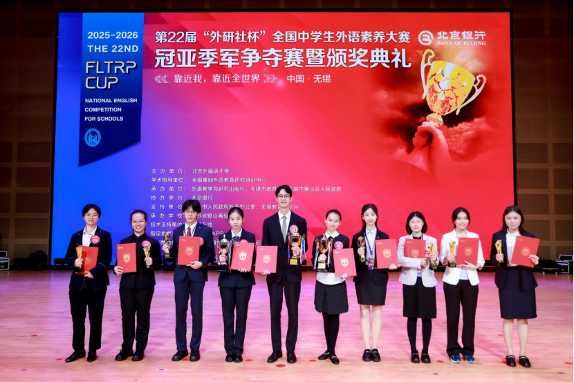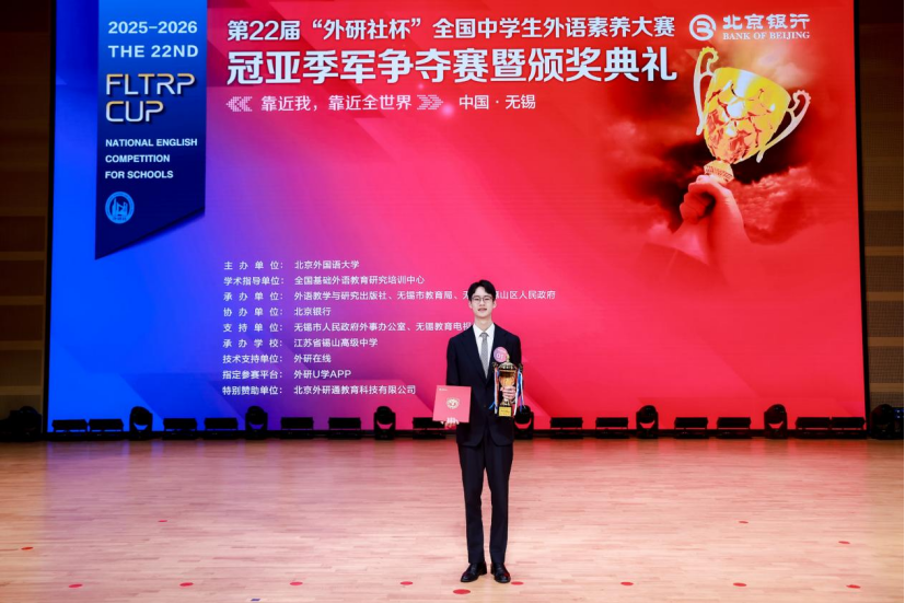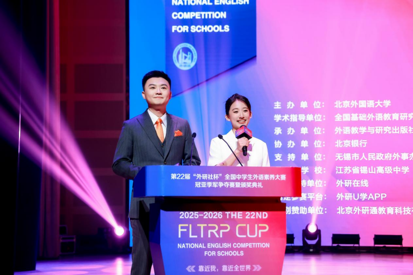 2026年3月30日,第22届“外研社杯”全国中学生外语素养大赛冠亚季军争夺赛暨颁奖典礼在江苏省锡山高级中学顺利举办。本届大赛由北京外国语大学主办、外语教学与研究出版社承办、北京银行协办,全国总决赛由江苏省无锡市教育局、无锡市惠山区人民政府、江苏省锡山高级中学承办,全国基础外语教育研究培训中心提供学术指导。