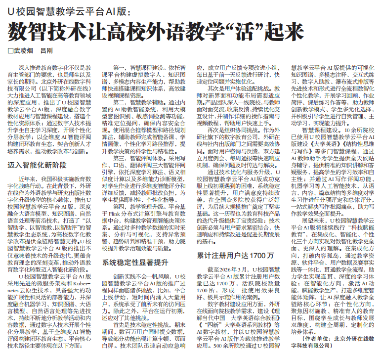 《中国新闻出版广电报》刊发《U校园智慧教学云平台AI版:数智技术让高校外语教学“活”起来》