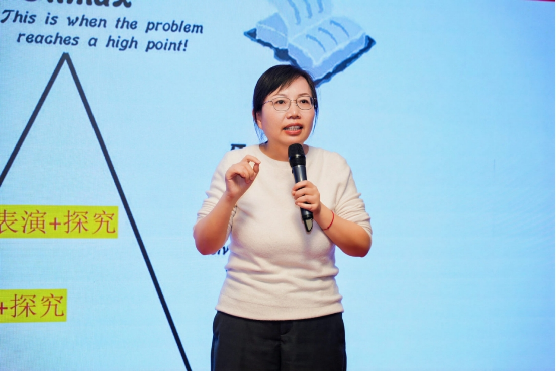 柯丹系统阐释了教育戏剧的内涵,强调教育戏剧以育人为目标,面向全体学生,聚焦过程性成长。她指出,教育戏剧能够促进外语课堂实现“坐着学”与“做中学”的有机结合,推动课堂向具身学习、情境体验、全员参与和以学生为中心的方向转型。结合现场体验,她引导与会教师认识到,戏剧融入课程有助于激发学生的想象力、创造力和同理心,促进核心素养提升。围绕落地路径,她介绍了教育戏剧融入国家课程、校本课程和社团课程的三种样态,详细解析了教育戏剧范式与不同课型、阅读技巧及英语学习活动观的融合方式。最后,她结合跨学科实践,展示了教育戏剧与英语教育的深度融合,生动诠释了“戏剧无界,融合有道”的教育理念。