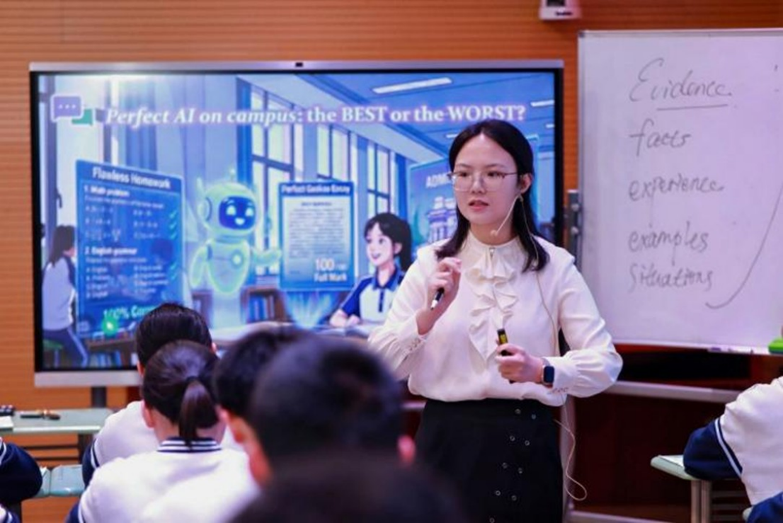 广东实验中学深圳学校教师孟可元围绕高中《英语》(新标准)修订版选择性必修第三册Unit 4 A glimpse of the future的Understanding ideas阅读课进行了教学展示及说课。该课的指导教师为深圳市教育科学研究院高中教研中心负责人、高中英语教研员于弟和广东实验中学深圳学校英语教研组组长于天茹。在教学展示环节,孟可元通过引用霍金的观点“AI will be either the best or the worst thing, ever to happen to humanity.”切入主题,引发学生的思考与讨论。接下来的课堂阅读教学分三步逐层推进:首先,通过标签匹配活动,引导学生整体把握三位发言者的核心观点;随后,引导学生先找出文中的具体事实依据,再找出带有主观态度的表述,分析二者如何共同支撑作者观点;最后,带领学生梳理文本逻辑,推断作者的态度。在课程的结尾,孟可元创设“校园完美AI”的实践情境,组织学生撰写论坛回复,实现知识的迁移运用。说课环节,孟可元立足核心素养导向,指出本课聚焦观点推断与批判性思维培养,紧扣高考阅读能力要求,引导学生深度解读文本、自主表达立场,实现语言学习与思维提升的有机统一。