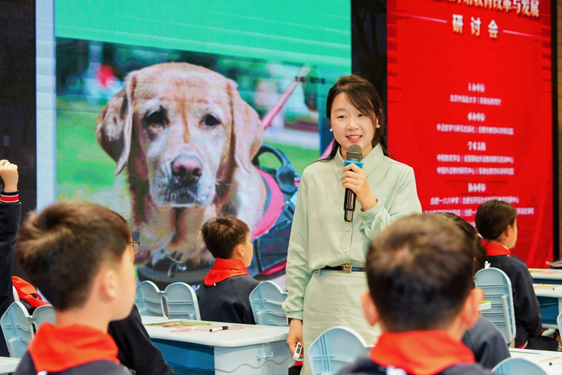 大庆市靓湖学校教师楚佳旭进行授课展示。她围绕读物中呈现的导盲犬Zak的日常工作内容,通过创设情境、情节预测、信息梳理等活动,引导学生在理解故事内容的过程中聚焦字母w、y、z的发音规律;在跟读与解码阅读中提升拼读能力,并进一步认识导盲犬的职责与价值;在“导盲犬与机器导盲犬”的辩证讨论中,引导学生关注科技进步可能为视障人士生活带来的便利,培养学生的人文关怀意识。本课指导教师为大庆市小学英语教研员何鸿燕和大庆市英语兼职教研员朱晓锋。楚佳旭在授课后进行说课分享。她在备课时充分考虑了本地学情和读物资源现状,以“学思结合,以创为本”为纲,制定了教学目标。她利用AI辅助课堂教学,带领学生探索多样化的问题解决路径,通过情境主线成功激发了学生兴趣,课堂讨论参与度高,语言目标达成良好,学生表现超出预期。最后,她反思了教学节奏中存在的问题。她表示,课堂讨论环节时间可适当延长,让学生们能够充分表达观点,深入探究主题意义。作为一名青年教师,楚佳旭希望自己未来能够继续扎根课堂教学,向优秀同仁学习,努力成为有智慧、有温度、有担当的英语教师。