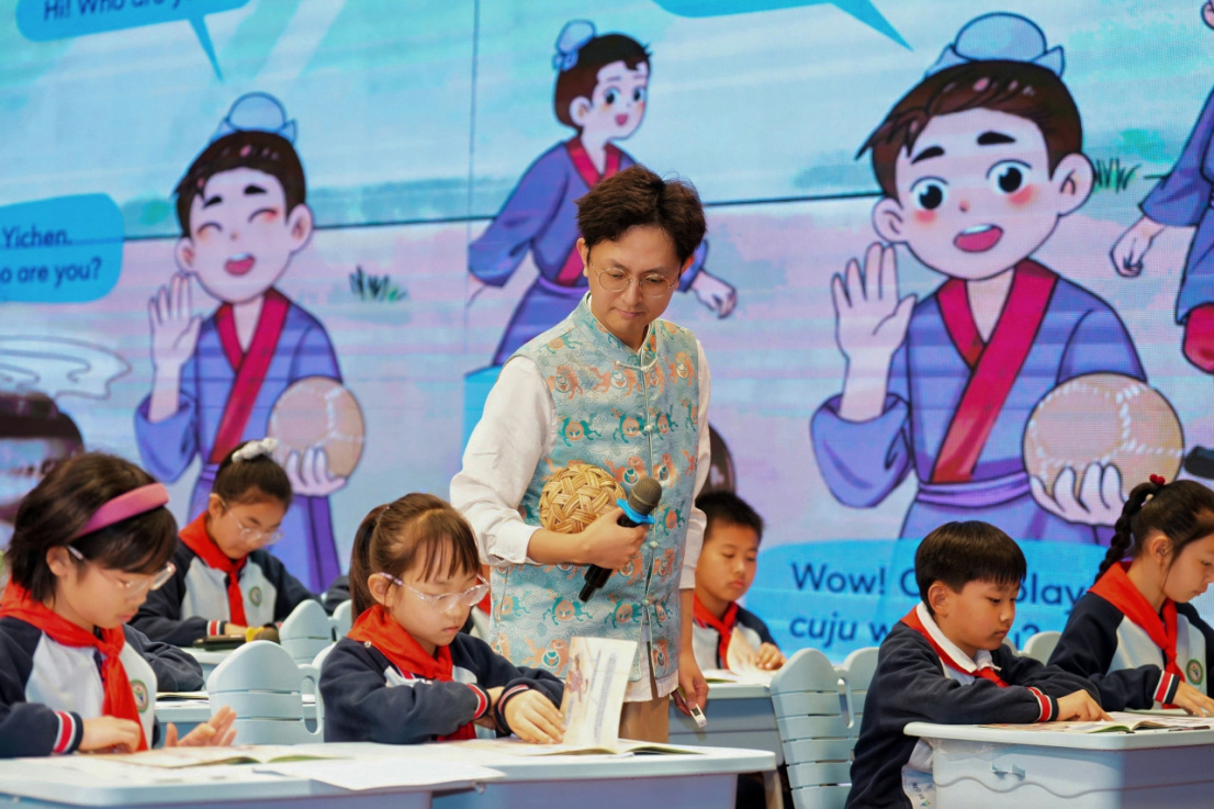 上海市浦东新区海桐小学教师周忠杰进行授课展示。他围绕读物主人公Yichen在游览蹴鞠博物馆时想象自己穿越到古代,并与古人一同蹴鞠的故事,通过猜谜游戏、信息梳理、体验蹴鞠游戏、复述故事等活动,激发学生阅读兴趣,引导学生在人物对话与情节发展中逐步了解蹴鞠的基本动作和比赛规则,让学生在真实情境中理解相关语言表达,感受中国传统体育文化的独特魅力。本课指导教师为上海市浦东教育发展研究院小学英语教研员叶建军。周忠杰在授课后进行说课分享。他依托KWL认知策略,引导学生在“预测—验证—反思”的学习闭环中开展阅读,促使学生在阅读过程中形成主动探究意识,提升自主阅读与文化理解能力。同时,课堂融入动画、真实足球比赛视频以及蹴鞠游戏体验等多模态学习资源,通过具身体验的方式激活学生的语言学习兴趣,让学生在动感体验中感受中国传统体育文化的魅力。最后,他借助SCOOP模型等可视化思维工具,为学生搭建清晰的复述支架,引导学生从零散信息走向结构化表达,在理解故事内容的基础上实现语言输出能力的提升。