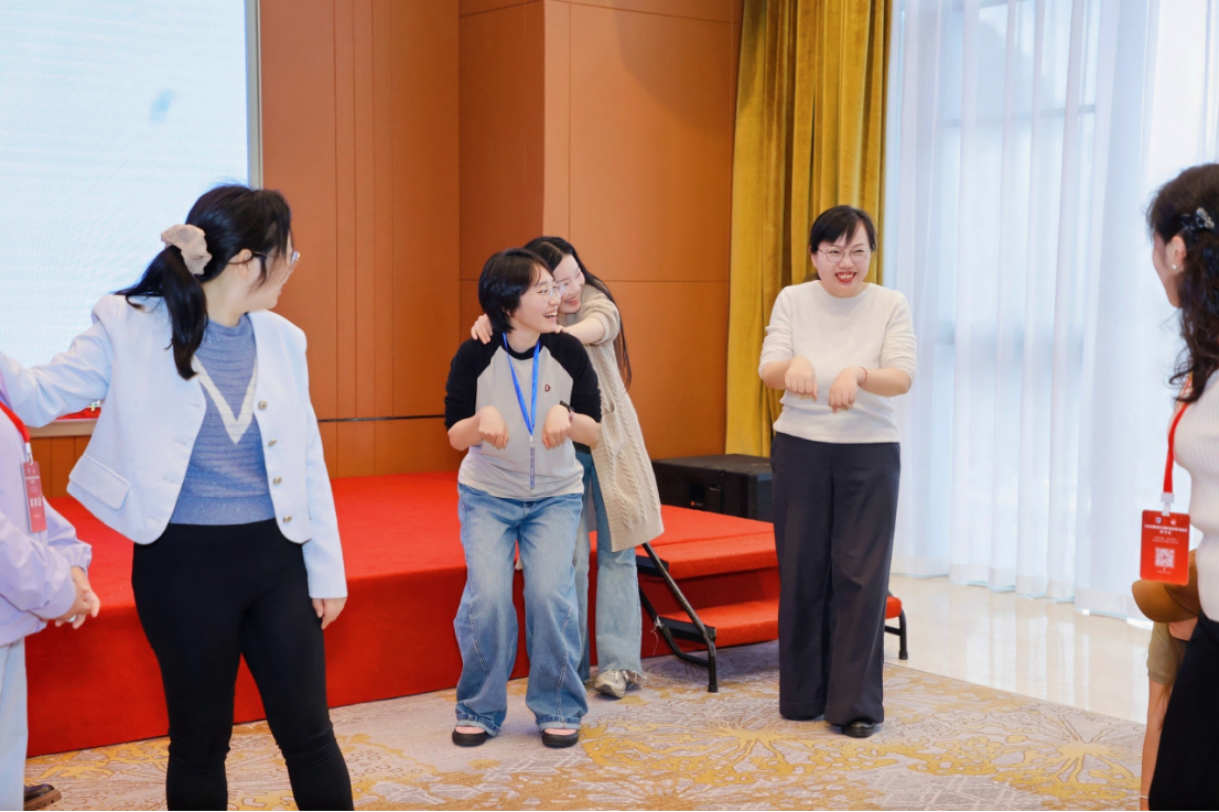 柯丹作题为“戏润课堂,育见成长——悠游戏剧坊范式体验与教学呈现”的主题发言。她以《悠游素养系列·戏剧坊·中国故事剧》为例,带领现场老师沉浸式体验教育戏剧课堂活动。围绕“读前——读中——读后”的教学流程,她展示了教育戏剧如何通过空间建构、角色体验、情境表演和反思表达等方式,推动学生深入理解文本、唤起情感共鸣、发展思维能力。整场分享突出“在体验中学习、在参与中成长”的理念,展现了教育戏剧在激活课堂氛围、增强表达勇气、提升合作能力和学习投入度方面的独特价值,为教师开展融合型英语课堂教学提供了生动启发。